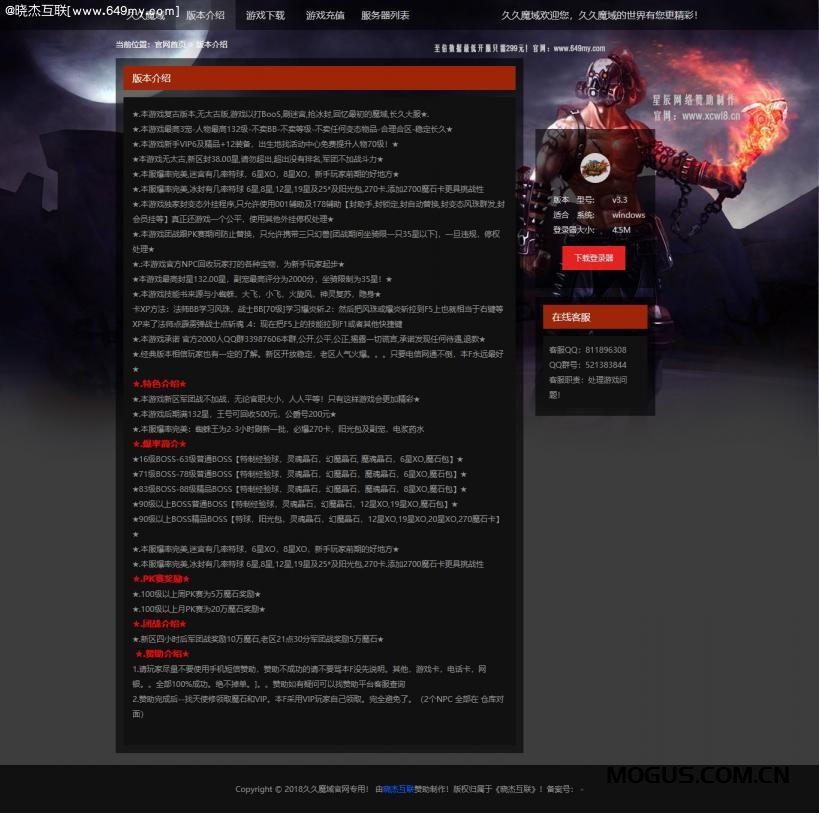 以前做的魔域开区模版,ASP后台,后台操作简单,此模版可以通用任何游戏的开区,好看大气简约!